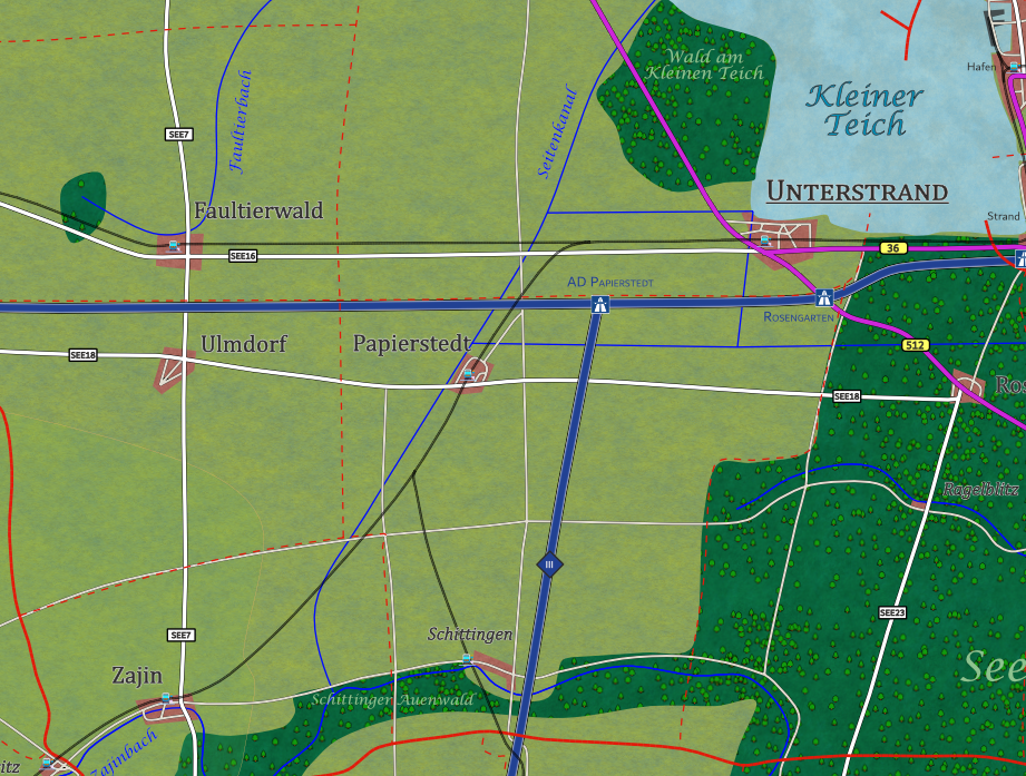 Zur Gemeinde Papierstedt gehört der Ort Schittingen: Schittingen, mit 524 Einwohnern auf 122 m NN, liegt im dichten Schittinger Auenwald am Zajinbach im Südwesten des Kreises Unterstrand. Der Ort ruht auf einer leichten Anhöhe über feuchten Wiesen und Wasserarmen, verbunden durch Bretterstege und kleine Brücken. Herzstück des Dorfes ist die Auenwolle Schittingen eG, eine Genossenschaft, die seit 1923 Wolle von Schafherden aus den Auen und Sandrücken des Seelandwaldes wäscht, sortiert und kardiert. Der Dampf aus den Blechwannen und der Geruch von Lanolin prägen das Dorfbild. Die Wolle gelangt weiter nach Papierstedt zum Werk „Vier Mühlen – Tuch & Strick“, während der Mist der Herden die Roggenfelder des Agrarverbunds Seeland-Ebene Unterstrand düngt. Ein handgewebtes Tuch aus Schittinger Wolle liegt im Altarraum der Maria-Magdalena-Kirche in Zajin. Der Auenpfad, ein 4,2 Kilometer langer Rundweg, führt Besucher durch Erlenwälder, über Stege und an einer alten Reusenhütte vorbei.