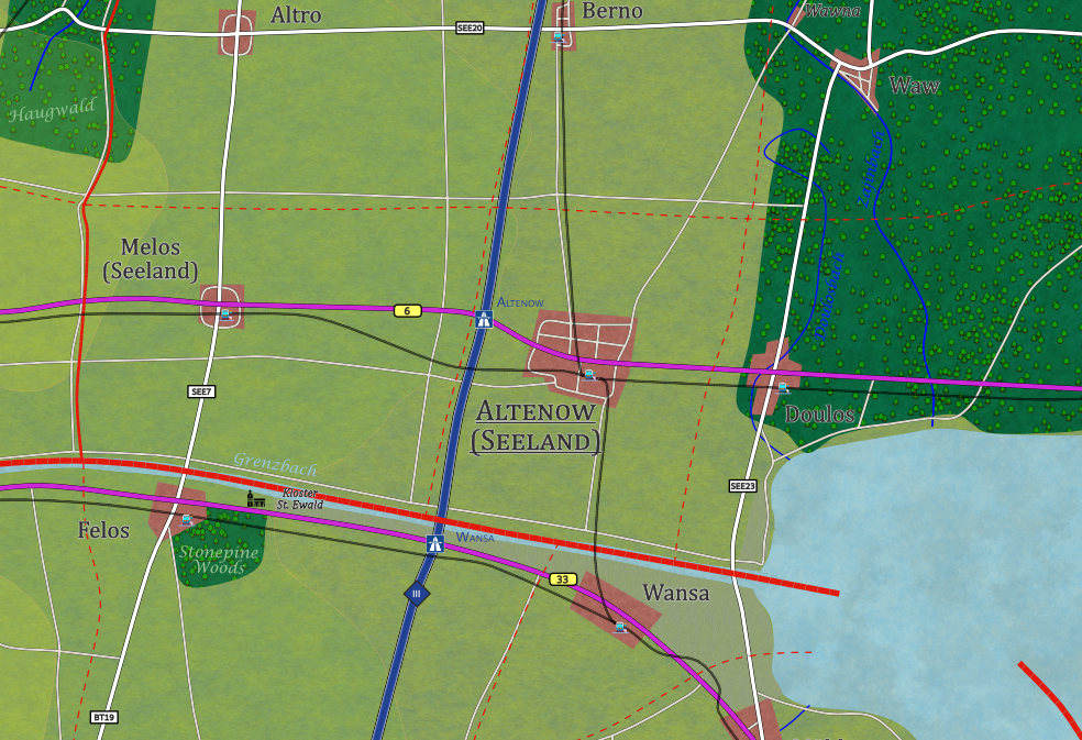 In Doulos zeigt sich diese Verbundenheit auch im Alltag. Viele Dorfbewohner arbeiten in den Holzwerken von Waw oder in der Papierfabrik von Altenow. Einige pendeln per Bahn – der Bahnhof von Doulos liegt am westlichen Ortsrand an der Linie SeeLB90. Von hier aus fahren stündlich Züge nach Kleinros und Zentro. In den frühen Morgenstunden steigen Holzarbeiter, Mühlenleute und Schüler in denselben Zug, und im Dorf heißt es dann: „Der 6:36er bringt die Arbeit.“ Am östlichen Ortsrand führt die B6 weiter nach Berenburg. Der Weg folgt dem Verlauf des Grenzsees, dessen Ufer sich in der Sonne spiegelt. Von hier aus sieht man Fischerboote, die im seichten Wasser ankern, und bei Wind hört man das Rauschen der Schilfgürtel. Auf einem kleinen Damm steht ein Steinkreuz, das an eine Flut von 1878 erinnert, bei der mehrere Mühlengebäude zerstört wurden.