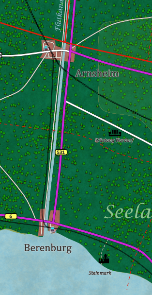 Berenburg (10,2km), ein Dorf mit 712 Einwohnern im Landkreis Altenow, liegt auf 98 Metern Höhe im südlichen Seelandwald, an der Stelle, wo der Flutkanal in den Grenzsee mündet. Der Ort entstand im 19. Jahrhundert als Umschlagplatz für Holz, das über den Kanal herantransportiert wurde, und behielt trotz seines Wandels die enge Verbindung zu Wasser und Wald. Heute ist Berenburg ein stilles Dorf mit einem kleinen Hafen, der Gaststätte „Zum Grenzblick“ und der historischen Schleuse XII, die den Pegelunterschied zwischen Kanal und See ausgleicht. Entlang des alten Treidelpfades fährt stündlich ein Schienenbus nach Arnsheim – eine lebendige Erinnerung an die frühere Holzbahn. Am Hafen befindet sich eine kleine Galerie mit Holzfiguren des Bildhauers Lennert Grau aus Waw, der hier regelmäßig ausstellt. Die Häuser ziehen sich terrassenförmig den Hang hinauf, viele mit Blick auf den Grenzsee, dessen Wasser das Leben des Ortes bestimmt. Berenburg ist ein Ort der Ruhe und des Gleichgewichts, geprägt von Handwerk, Geschichte und dem beständigen Rhythmus von Wasser und Arbeit.