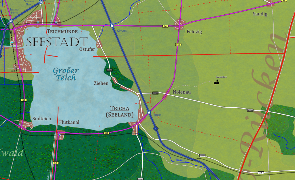 Nolenau liegt höher als der Große Teich, auf 169 Metern, an der Stelle, wo die Landschaft beginnt, sich zum Zento-Rücken zu heben. Das Dorf selbst besteht aus wenigen Höfen, die locker um eine dreieckige Grünfläche gruppiert sind. In ihrer Mitte steht eine Linde, deren Äste so tief hängen, dass Kinder sich im Sommer darunter verstecken und Erwachsene den Kopf einziehen müssen, wenn sie den schmalen Trampelpfad unter dem Baum benutzen. Bänke stehen im Schatten, ein hydrantrotes Pumpengehäuse neben einem Sandkasten, der zwar offiziell für die Kinder ist, aber genauso gut als Ablage für Einkaufstaschen taugt. An dieser Grünfläche kreuzen sich die wichtigsten Wege: die Dorfstraße, die als B512 weiter nach Teicha führt, der Ziehener Weg (SEE22) und der schmale Fahrweg, der als Nolenauer Höhe den Hang hinauf zur Alten Wacht zieht.