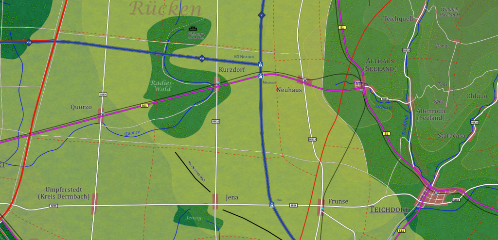 Straße: Autobahndreieck Neuhaus: A6 (W: Kohla), A5 (N: Nudeltopf, S: Seestadt); B361 (W: Quorzo 10km, O: Neuhaus 7km), SEE11 (S: Jena 10km, N: Radies 9km)