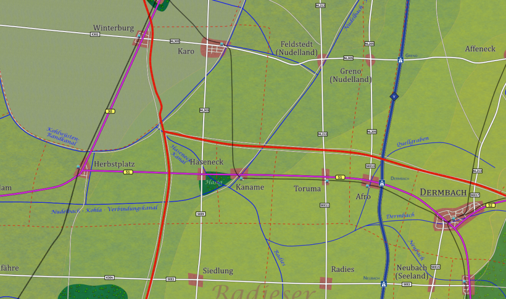 Straße: B51 (W: Herbstplatz 8km; O: Kaname 2km); SEE9 (S: Siedlung 8km, weiter als NL303 N: Karo 9km)