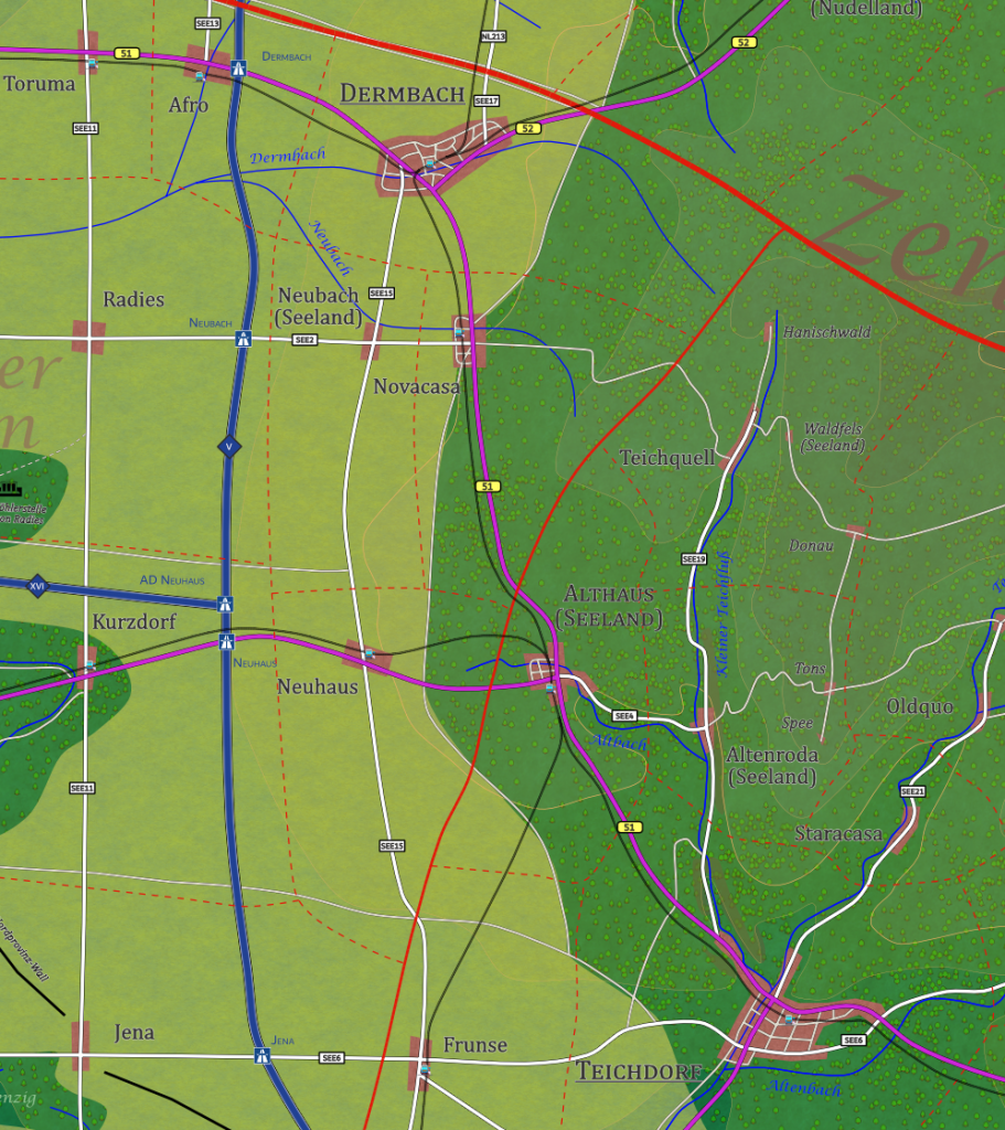 Straße: B51 (N: Novacasa 10km, SO: Teichdorf 11,5km); B361 (W: Neuhaus 5km); SEE4 (O: Altenroda 5km)
