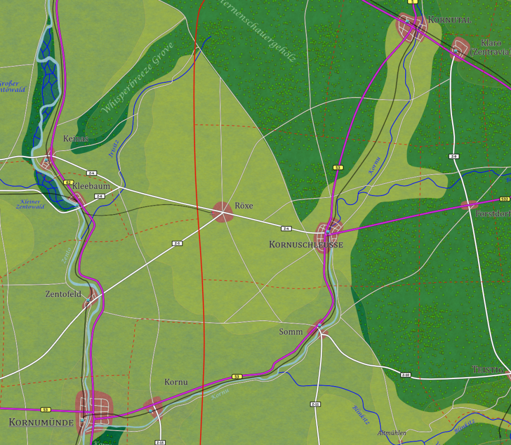 Nur eine kurze Zugfahrt von der Kreisstadt Kornumünde entfernt liegt das idyllische Dorf Kornu (4,8km) in einer Flussschleife des Kornu. Der Ort verdankt seinen Namen der Flusskrümmung und entstand einst als Siedlung von Fischern und Müllern. Von dieser Vergangenheit zeugt die sorgfältig restaurierte Kornu-Mühle aus dem 17. Jahrhundert, heute ein beliebtes Fotomotiv und Veranstaltungsort für Kunsthandwerksmärkte. Überragt wird das Dorf von der romanischen Kirche, deren Innenraum mit farbenprächtigen Fresken aus dem frühen Zentravia geschmückt ist. Zwischen blühenden Obstgärten und Bauernhöfen hat sich ein bemerkenswerter Betrieb für Präzisionsinstrumente angesiedelt, der fernab der Großstadtruhe High-Tech-Komponenten für Labore in Zentro fertigt. An heißen Sommertagen zieht es Einheimische und Gäste an die gepflegte Badestelle unter alten Weiden. Gesellschaftlicher Mittelpunkt ist das Gasthaus „Zur Kornubrücke“, wo regionale Küche und gastliche Atmosphäre gepflegt werden. Mit der stündlichen Kornutalbahn erreicht man Kornu bequem von Kornumünde aus. Wer dem Alltag entfliehen und ländliche Beschaulichkeit in historischem Ambiente genießen möchte, ist hier genau richtig.