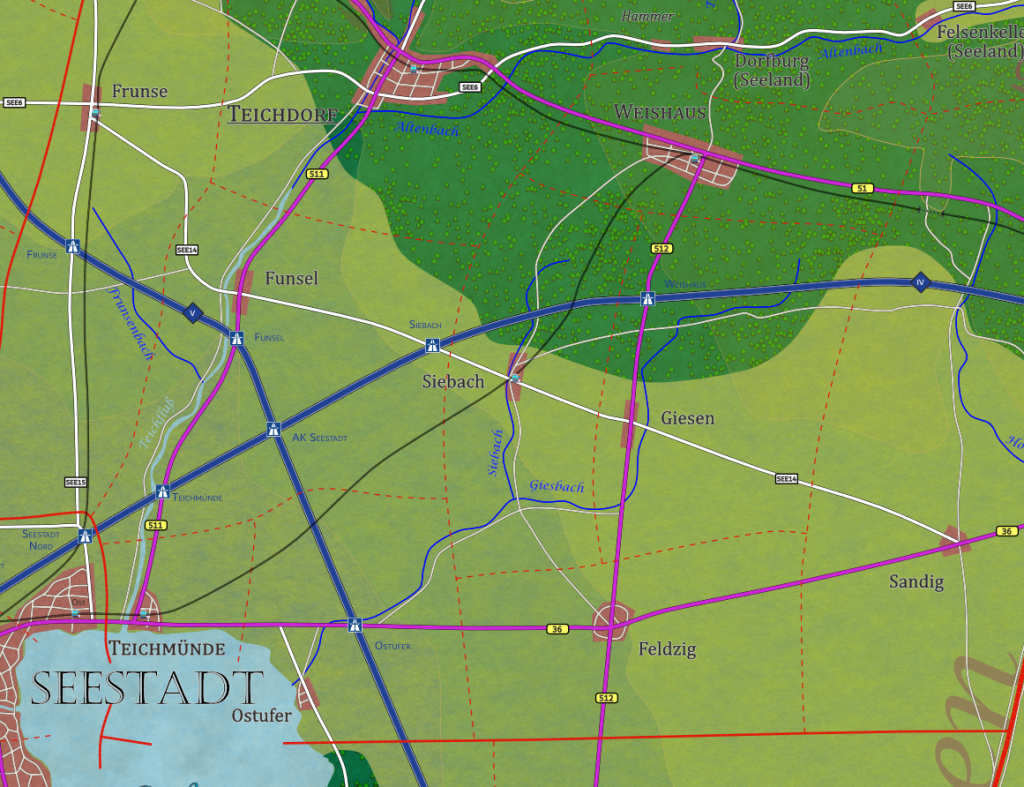 Straße: Autobahn A4 (W: Seestadt, O: Tremo); SEE14 (W: Funsel 9km, O: Giesen 4km); Siebachweg (N: Weishaus 9km, S: Feldzig 8,5km, Ostufer, Teichmünde)