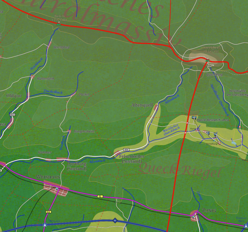 Straße: SEE6 (SW: Felsenkeller 9km), Gebirgsstraßen bis hinauf zum Kamm des Westmassivs und hinüber nach Holzmühle am Queckberg und Ferkelau in Zentravia und auch nach Norden nach Altzethau im Nudelland.