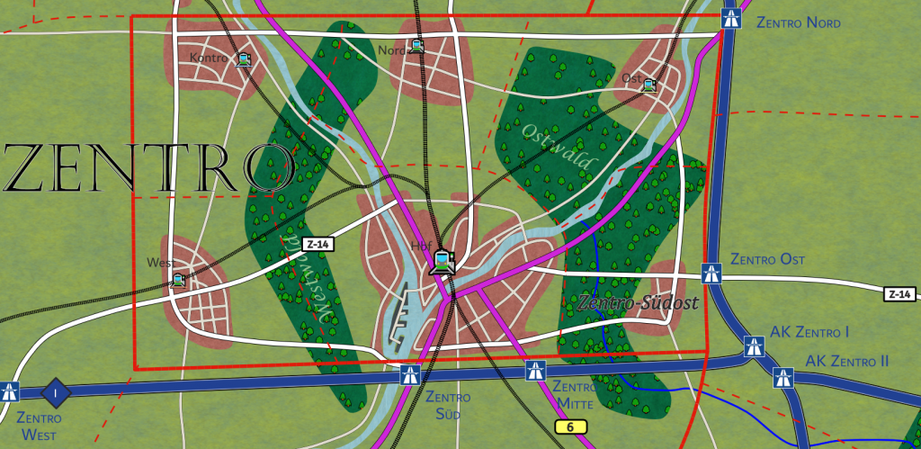 Wer Zentro heute beschreiben will, kommt an der Teilung in sechs Stadtteile nicht vorbei, Stadtteile, die jeweils eigene Institutionen tragen: Mitte als Verwaltungs- und Schriftkern, Kontro als Werk- und Lagerraum, Nord als Dienst- und Schulband, Ost als Labor- und Versorgungsquartier, Südost als Wasser- und Auenrand und West als Übergang zur Ebene mit Mühle, Silos und Vereinen. Das wirkt nicht wie eine bewusst inszenierte Hauptstadt, sondern wie eine Stadt, die aus Arbeitsschritten gebaut wurde: schreiben, prüfen, herstellen, lagern, reparieren, archivieren.