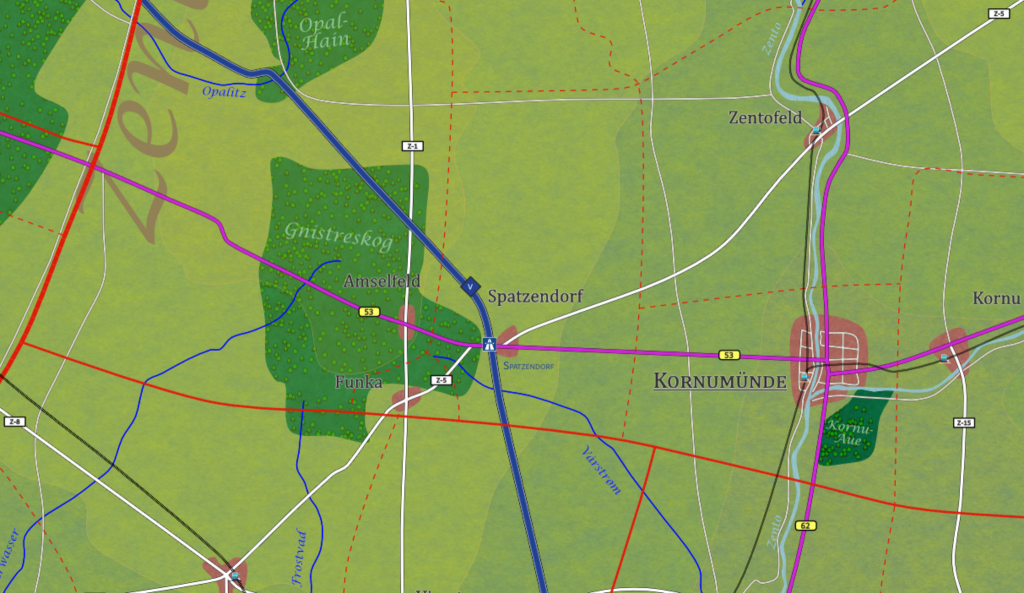 Straße: Autobahn A5 (NW: Seestadt, S: Zentro); B53 (W: Amselfeld 3km, O: Kornumünde 9km); Z-5 (SW: Funka 3km, NO: Zentofeld 12km)