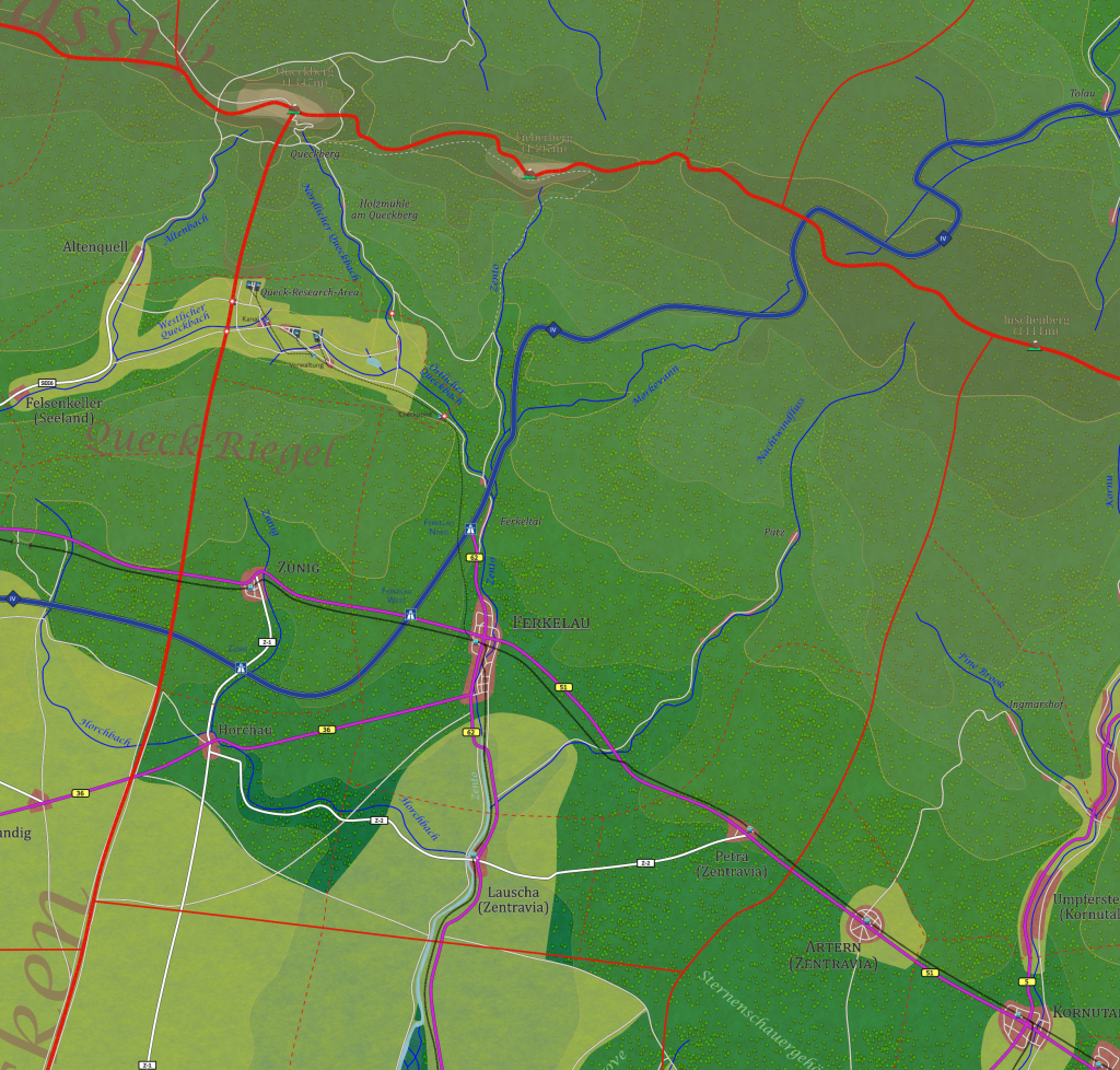Die Queck-Research-Area liegt nordwestlich von Ferkelau in einem abgeschiedenen Tal, das vom Östlichen und Westlichen Queckbach durchzogen wird. Das Areal ist seit 1952 Sperrgebiet und wird von einem Zaun umgeben, der nur an einem bewachten Tor durchbrochen wird. Offiziell wird hier an geologischen und meteorologischen Phänomenen des Zentralmassivs geforscht, doch in Ferkelau kursieren seit Jahrzehnten Gerüchte über Experimente, die mit der ungewöhnlichen Magnetfeldstruktur der Region zusammenhängen. Historische Gebäude gibt es kaum, doch die alte Queckmühle, die heute als Verwaltungsgebäude dient, stammt aus dem 18. Jahrhundert. Die Anlage verfügt über eine eigene Bahnverbindung, die Queck Research Railway, die Material und Personal transportiert. Für Besucher ist das Gebiet nicht zugänglich, doch ein Aussichtspunkt an der Zentotalstraße erlaubt einen Blick auf die Täler, in denen die Forschungsstationen liegen.