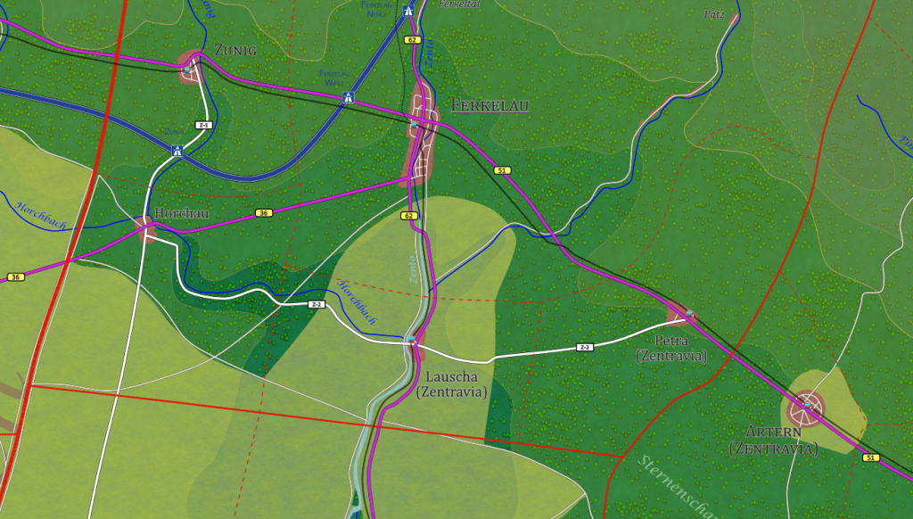 Lauscha liegt südlich der Kreisstadt Ferkelau, dort, wo der Zento nach seiner Reise aus dem Zentralmassiv schiffbar wird. Die Landschaft öffnet sich hier zu einer breiten Flussszenerie, in der sich Wasser, Wiesen und sanfte Hügel gegenseitig Raum geben. Lauscha selbst entstand an der Ostseite des Zento gegenüber der Mündung des Horchbachs, einem klaren, schnellen Gebirgsbach, der zwischen moosigen Steinen herabfließt. Dass sich gerade hier ein Umschlagplatz für Holz und Stein entwickelte, überrascht kaum: Die Flößer aus dem Massiv brachten ihre Stämme bis zur Mündung, und die Steinmetze aus den nördlichen Tälern nutzten den Ort als Zwischenstation, bevor ihre Waren weiter nach Zentro oder Bierona verschifft wurden. Noch heute erzählen ältere Bewohner, wie man früher die schweren Lastkähne mit langen Stangen vom Ufer abstieß und der Zento die Arbeit übernahm.
