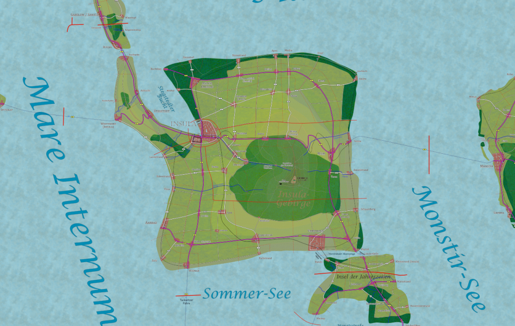 Die Hafenstadt Insula und die Zeit des vereinigten Königreichs: Unter storhischer Verwaltung erlebte die Insel einen wirtschaftlichen Aufschwung. Bereits 1162 begann der Ausbau der Siedlung an der Stegstedter Bucht zur planmäßigen Hafenstadt, die schlicht „Insula“ – die Stadt der Insel – genannt wurde. Die Stadt wuchs rasch: Handwerker, Händler und Seeleute ließen sich nieder, eine Stadtmauer entstand, und der Marktplatz wurde zum pulsierenden Zentrum. Das Kloster Sancta Catherina blieb kulturelles Herz der Insel, doch die politische Macht verlagerte sich nun an die Küste. Als 1452 das Königreich Storha und das Despotat Storcha durch Erbschaft zum vereinigten Königreich Storcha zusammenwuchsen, blieb Insula eine von nunmehr 37 Provinzen. Die Stadt Insula wurde Sitz eines Provinzgouverneurs. Besonders unter König Laurentius (1756–1801) profitierte die Insel von Infrastrukturmaßnahmen: Der Hafen wurde ausgebaut, eine regelmäßige Schiffsverbindung zur Zentralinsel eingerichtet, und die ersten befestigten Straßen durchzogen das Inselinnere.