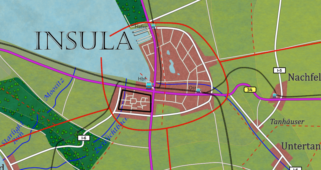 Die Stadt Insula, heute Hauptstadt des gleichnamigen Inselstaates, verdankt ihre Entstehung der strategischen Weitsicht des storhischen Königs Zinzad. Nachdem die Insel 1158 endgültig an das Königreich Storha gefallen war, erkannte der König die Notwendigkeit eines zentralen Verwaltungs- und Handelsstützpunktes. Die Wahl fiel auf die natürliche Stegstedter Bucht an der Südküste – ein geschützter Hafen, der bereits von Fischern und gelegentlichen Händlern genutzt wurde. Ab 1162 ließ der königliche Statthalter die Siedlung planmäßig ausbauen. Zunächst entstanden ein befestigtes Lager, eine hölzerne Anlegestelle und einfache Wohnhäuser für Soldaten und Beamte. Der Name der Stadt – schlicht „Insula“ – betonte ihre Funktion als Hauptort der ganzen Insel. Bereits Ende des 12. Jahrhunderts hatte sich ein regelmäßiger Markt etabliert, und Kaufleute aus Storha, Butha und sogar aus den ehemaligen Gebieten Ackeros ließen sich nieder. Um 1200 wurde die erste steinerne Stadtmauer errichtet, deren Reste heute noch im ältesten Viertel nahe dem alten Hafen am heutigen Hauptbahnhof zu sehen sind.
