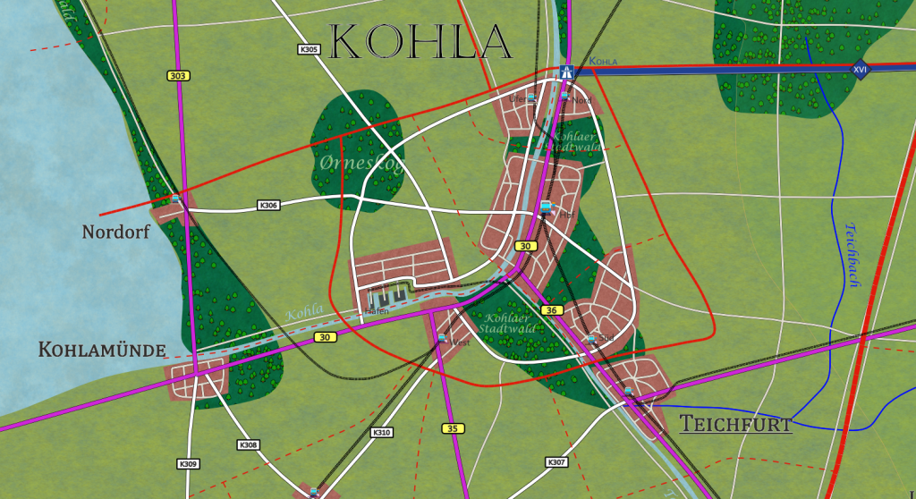 Kohla Hafen liegt westlich der Altstadt sechs Kilometer vor Mündung des Kohla-Flusses in die Sturmsee und zählt 1.421 Einwohner auf einer Höhe von 18 Metern über dem Meeresspiegel. Anders als der Name vermuten lässt, handelt es sich nicht um den alten Fürstenhafen, sondern um den Neuen Hafen, dessen Geschichte eng mit der Industrialisierung Kohlonias verknüpft ist. Als im Zuge der Entdeckung reicher Steinkohleflöze im Kohlgebirge zur Zeit König Laurentius‘ der Abbau rasch anwuchs, erwies sich der alte Hafen an der Mündung des Teichflusses bald als unzureichend. Die Kais waren zu schmal, das Fahrwasser zu flach für die schwer beladenen Frachtsegler. Im Jahre 1765 begannen daher die Bauarbeiten für einen neuen, großzügig dimensionierten Hafen weiter flussabwärts, sechs Kilometer vor der Sturmseeküste. Parallel dazu wurden Lagerhallen, Kontore und erste Wohnhäuser für die Hafenarbeiter errichtet – die Keimzelle des heutigen Stadtteils. Bis weit ins 19. Jahrhundert hinein war Kohla Hafen der entscheidende Umschlagplatz für die Steinkohle aus den Bergwerken von Zusma, Feltal und Felmarn. Täglich legten hier Schiffe nach Buthanien, ins Sturmland und zu den südlichen Reichen Landauris ab, beladen mit dem schwarzen Gold, das Kohlonia seinen bescheidenen Wohlstand brachte. Aus dieser Zeit stammen noch einige der alten Speicherbauten entlang der Hafenstraße, die jedoch längst nicht mehr der Kohle, sondern anderen Zwecken dienen.